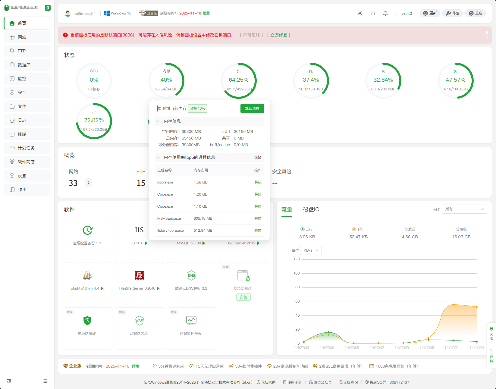 宝塔Windows面板是提升运维效率的服务器管理软件,支持Windows Server 2012/Windows 8及以上系统